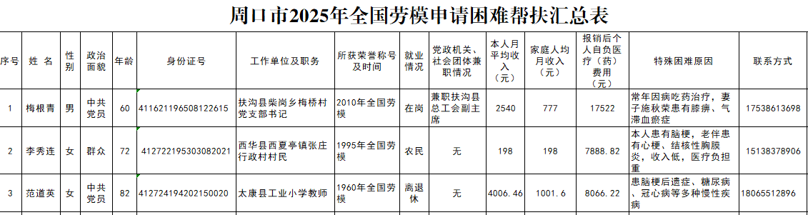 周口市2025年度省级以上劳模申请困难救助情况的公示