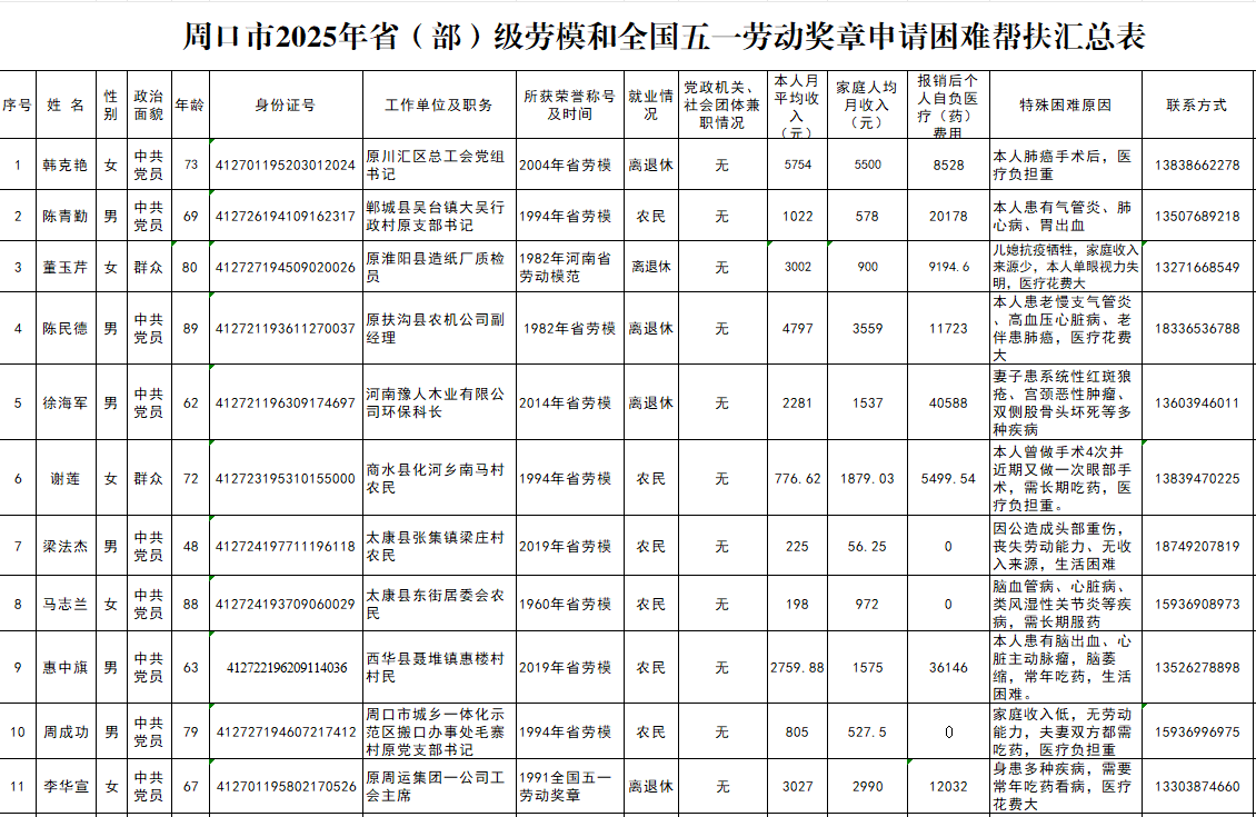 - 2025/10/9 周口市2025年度省级以上劳模申请困难救助情况的公示