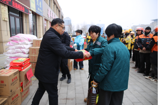 活动现场,米、面、油等慰问品摆放整齐,一幅幅鲜红的春联福字烘托出喜庆的新春氛围,劳动者们脸上洋溢着质朴的笑容。项城市总工会党组书记、常务副主席赵岚峰为到场职工逐一送上暖心礼包,与大家亲切交谈,详细询问日常工作时长、收入状况、冬日出行保障等情况,细致了解大家工作生活中遇到的实际困难。