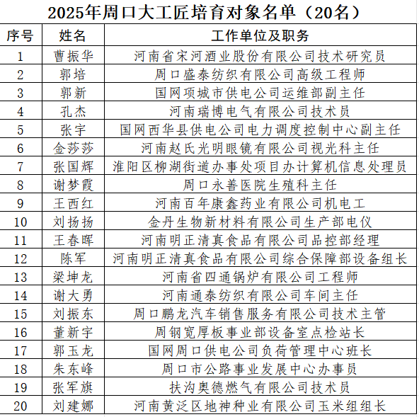 为深入贯彻中央、省、市关于产业工人队伍建设改革的决策部署,着力培养造就更多适应新时代发展需要的技能人才,根据《周口大工匠培育工程实施办法》《关于推荐2025年周口大工匠培育对象的通知》,经基层申报、各级推荐、资格审查、专家评审等程序,确定2025年周口大工匠培育对象20名。现予以公示,接受社会监督。
