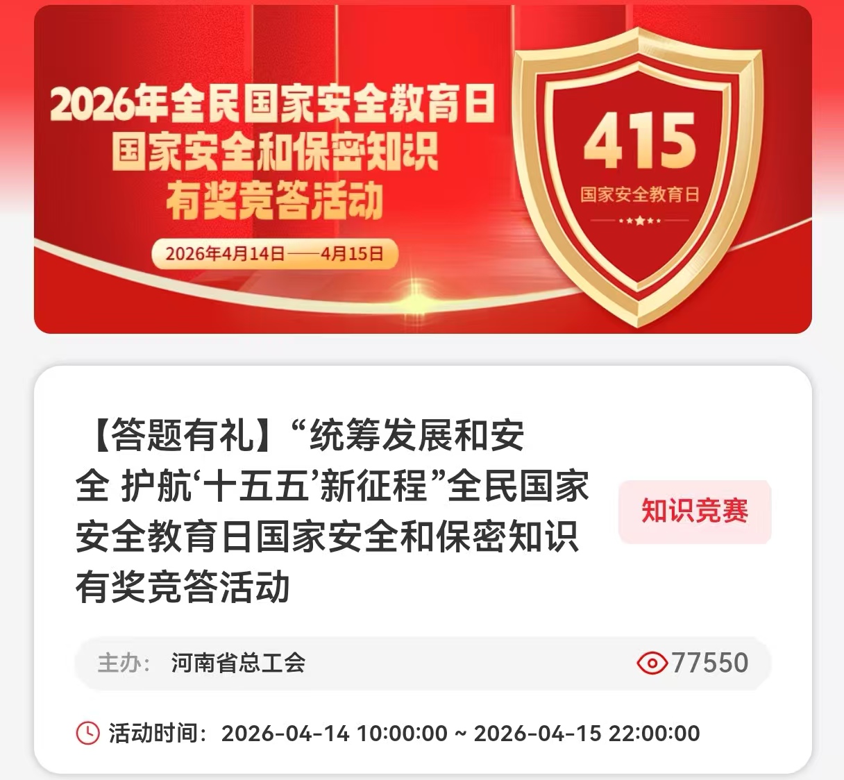 2026年4月15日是第十一个全民国家安全教育日,今年主题为“统筹发展和安全 护航‘十五五’新征程”。为深入贯彻总体国家安全观,增强职工群众国家安全意识,周口市总工会精心组织、多点发力,开展形式多样的国家安全宣传教育活动。