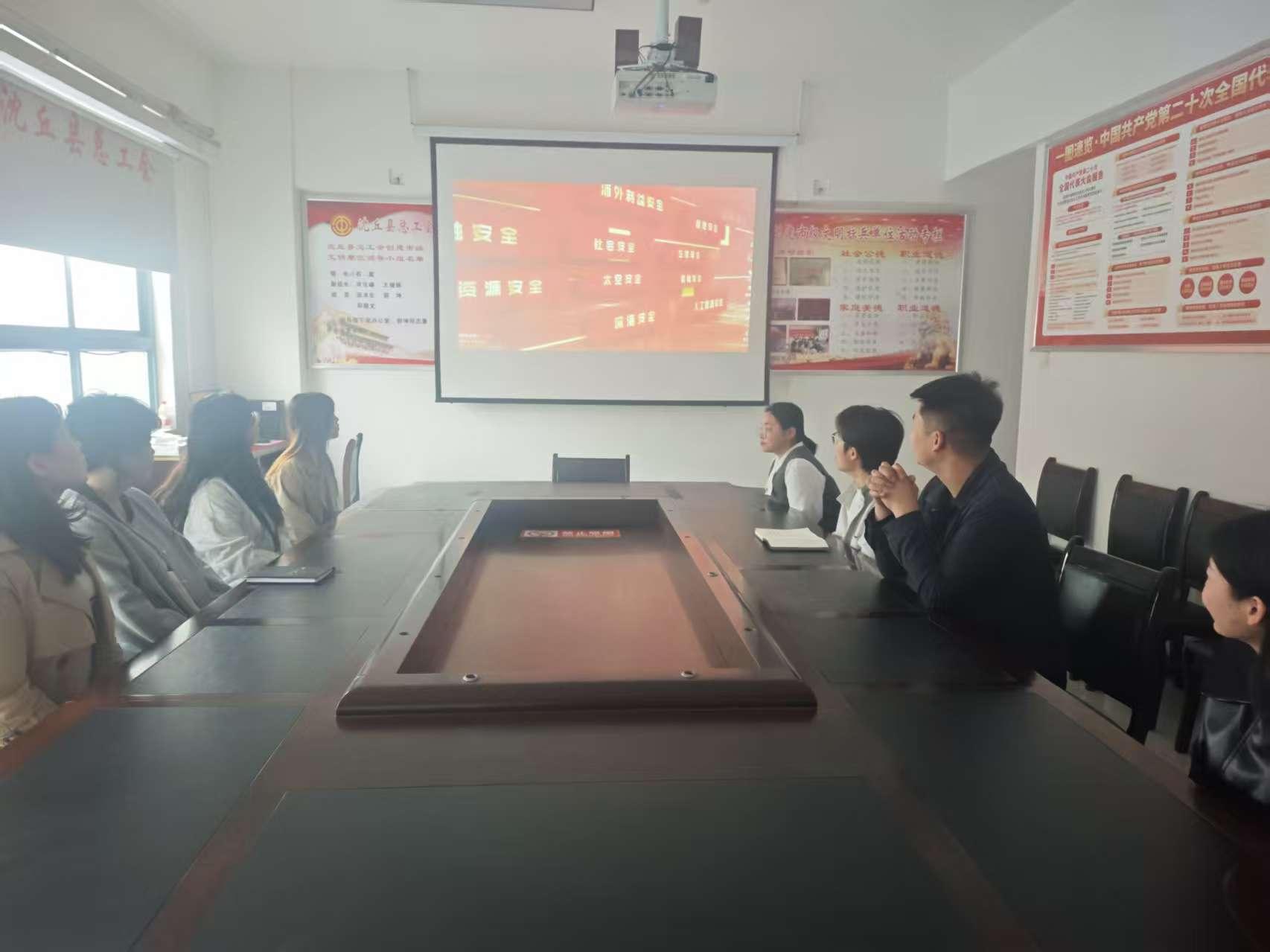 沈丘县总工会组织全体干部职工集中观看国家安全主题宣传片,围绕政治、网络、数据、保密等安全领域,结合真实案例深入剖析风险与后果,阐释总体国家安全观,进一步筑牢思想防线,增强维护国家安全、严守工作秘密的思想观念和行动自觉。